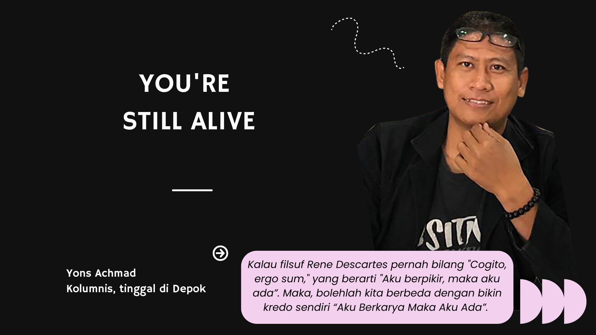 Benar, tak lain dan tak bukan masih tetap terus bekerja, berkarya. Tanpa itu, bisa jadi sebenarnya kita sudah mati walau raga sehat dan jiwa masih bernyawa. Ya, itu sebagai tanda “You’re still alive” (Kamu masih hidup). Kalau filsuf Rene Descartes pernah bilang “Cogito, ergo sum,” yang berarti “Aku berpikir, maka aku ada”. Maka, bolehlah kita berbeda dengan bikin kredo sendiri “Aku Berkarya Maka Aku Ada”.